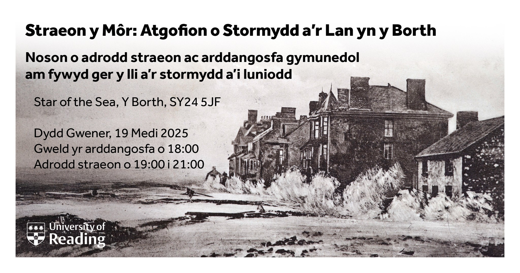 Mae’r digwyddiad hwn yn rhan o brosiect ymchwil gan Brifysgol Reading sy’n casglu ac yn rhannu’r cyfoeth anhygoel o straeon sy’n gysylltiedig â’r môr, y gwynt neu’r stormydd sydd gennym yn Borth.